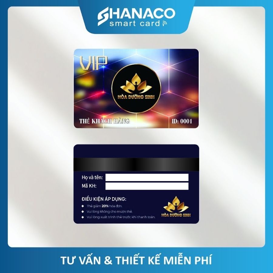 Bề mặt thẻ có thể in logo thương hiệu, tên, mã khách hàng, mã QR hoặc mã vạch, giúp quản lý thông tin khách hàng dễ dàng hơn. Thiết kế thẻ VIP cũng góp phần tăng nhận diện thương hiệu và tạo cảm giác cao cấp, chuyên nghiệp cho khách hàng khi sử dụng dịch vụ.